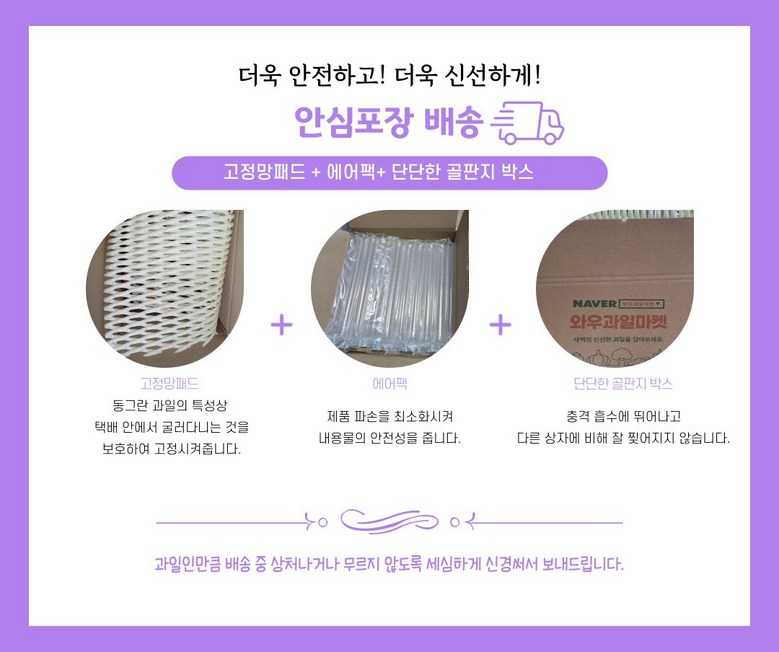 | 배송방법 | 신선/냉장/냉동 | 배송비 | 무료배송 · 도서산간 추가 배송비 - 제주 지역: 3,000원 - 도서산간 지역: 6,000원 |