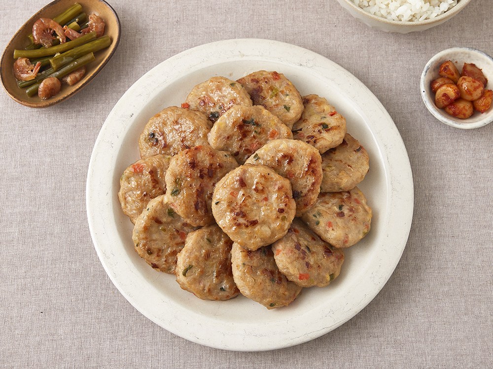 고소한 육즙을 만끽할 수 있는 동그랑땡이에요. 일일이 재료를 반죽하고 부쳐낼 필요 없이, 팬에 간단히 구워주기만 하면 완성되죠. 한입 먹어보면, 부드러운 식감에 자꾸 손이 간답니다. 그대로 드셔도 맛있고, 간장이나 케첩만 콕 찍어 감칠맛을 음미해도 좋아요.