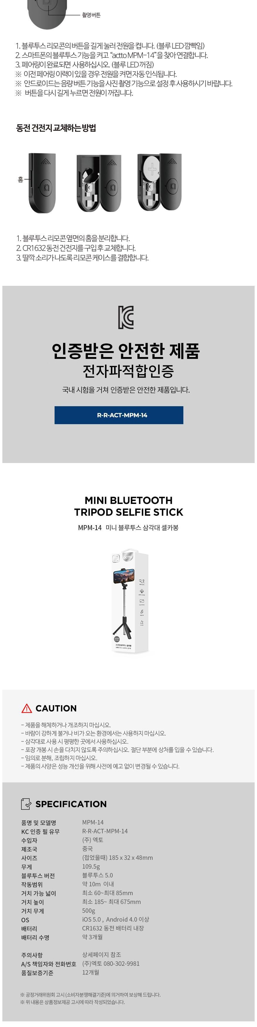 | 품명 및 모델명 | 미니 블루투스 셀카봉/MPM-14 | 인증/허가 사항 | R-R-ACT-MPM-14 |