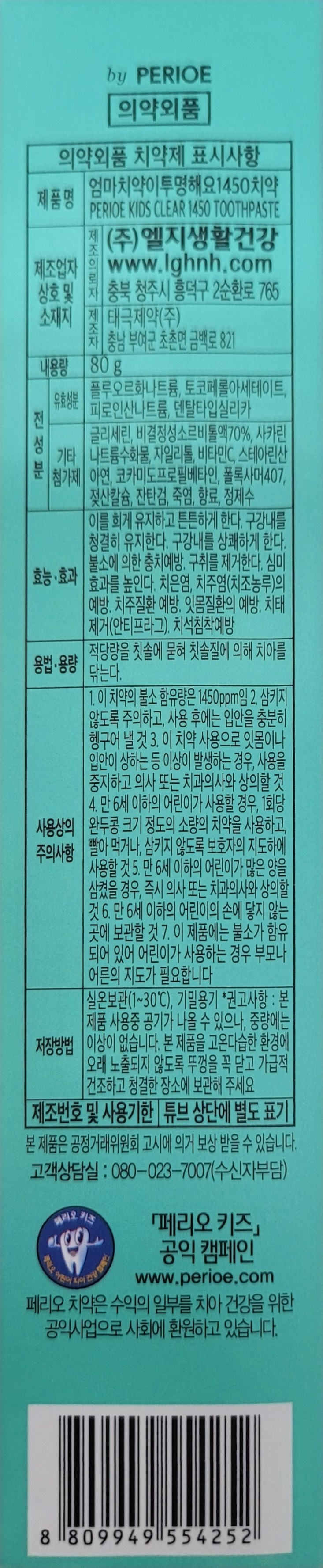 | 품명 및 모델명 | 엄마치약이투명해요1450치약 | 인증/허가 사항 | 의약외품 |