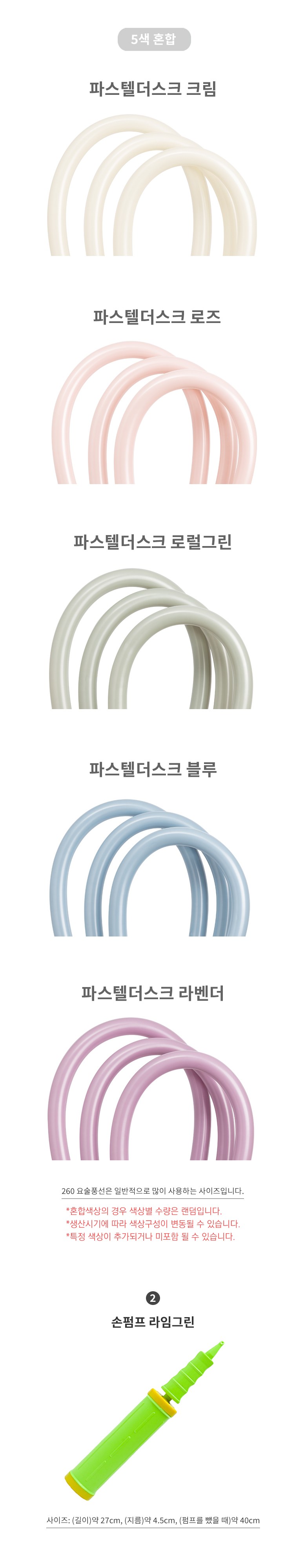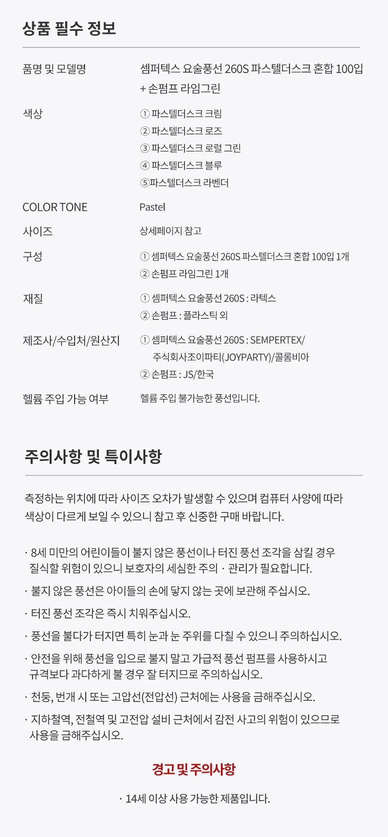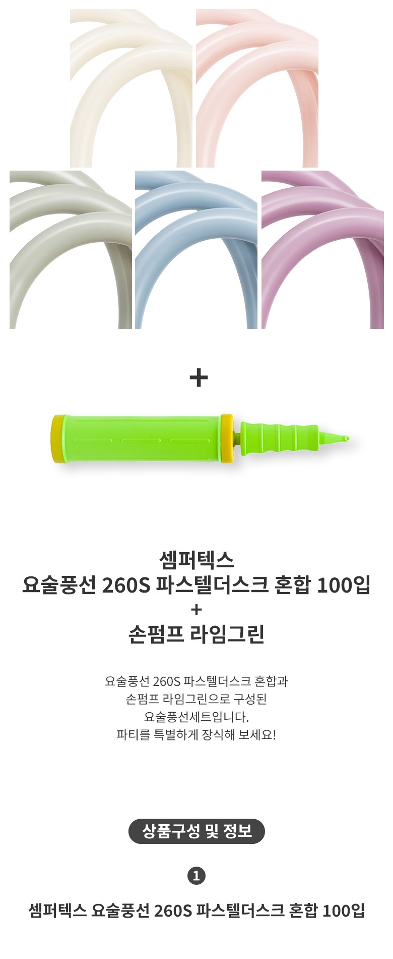 | 품명 및 모델명 | 셈퍼텍스 요술풍선 260S 파스텔더스크 혼합 100입+손펌프 핑크 | 인증/허가 사항 | 해당없음(14세이상) |