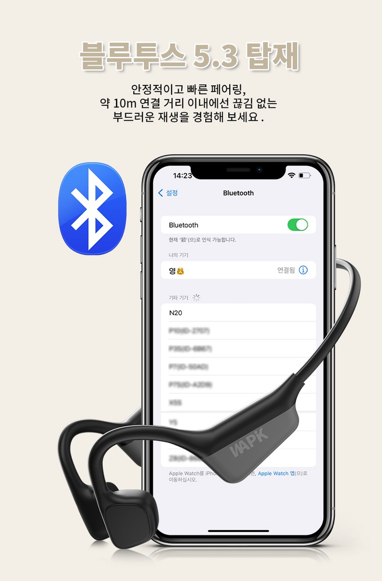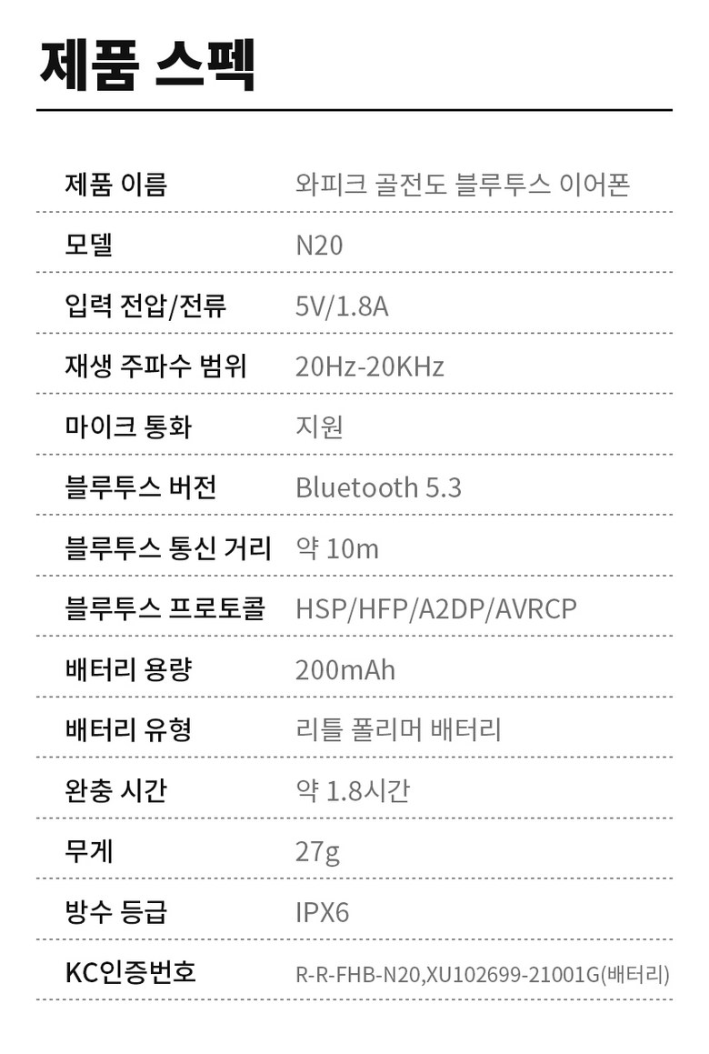 | 품명 및 모델명 | Wapik 와피크 오픈형 블루투스 골전도 이어폰 N20 무선 IPX6 방수 귀걸이형 | KC 인증정보 | 본품:R-R-FHB-N20 배터리:XU102699-21001G |
