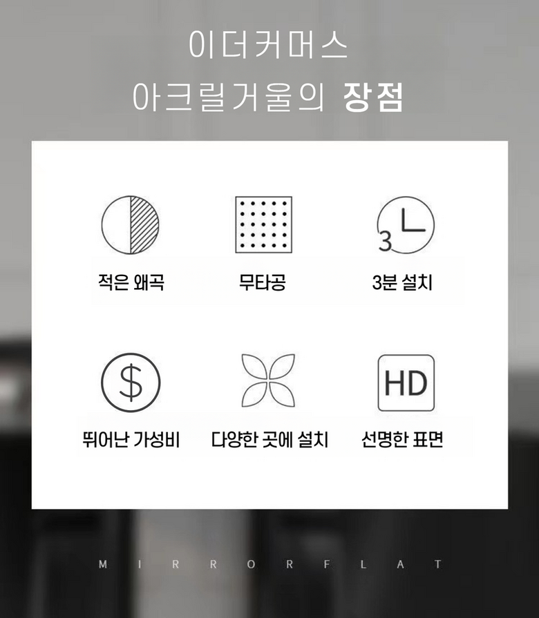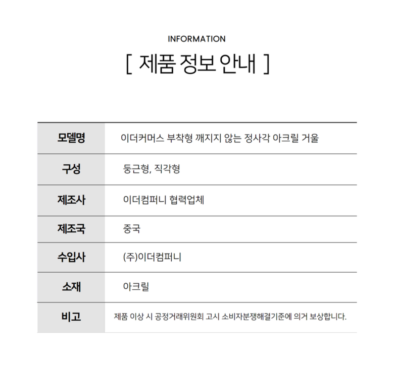 | 품명 및 모델명 | 이더커머스 부착형 깨지지 않는 정사각 아크릴 거울 | 인증/허가 사항 | 상품 상세페이지 참조 |