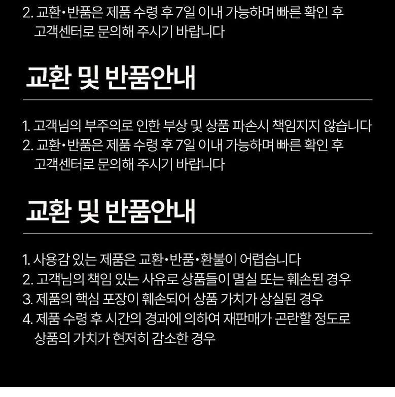 - ㆍ교환/반품에 관한 일반적인 사항은 판매자가 제시사항보다 관계법령이 우선합니다.