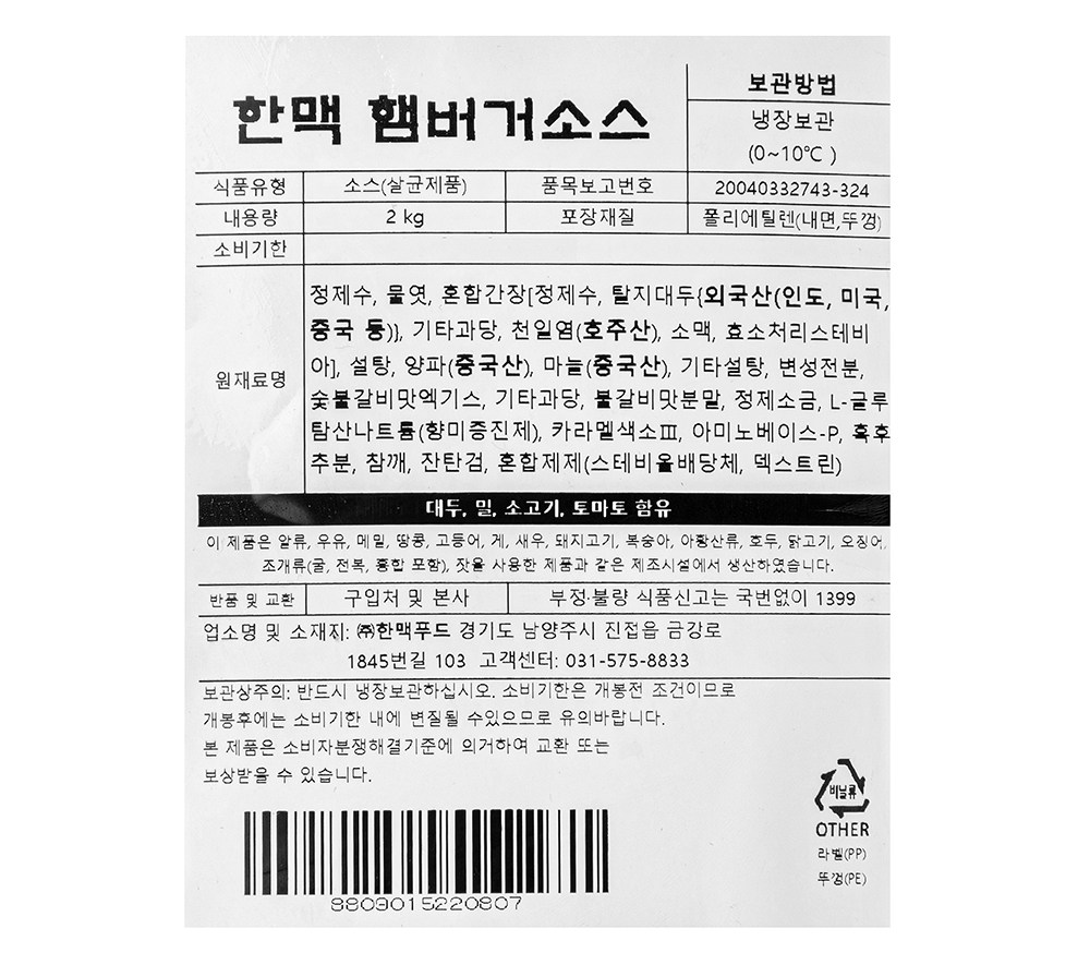 | 제품명 | 한맥 햄버거소스 | 식품의 유형 | 컨텐츠참조 |