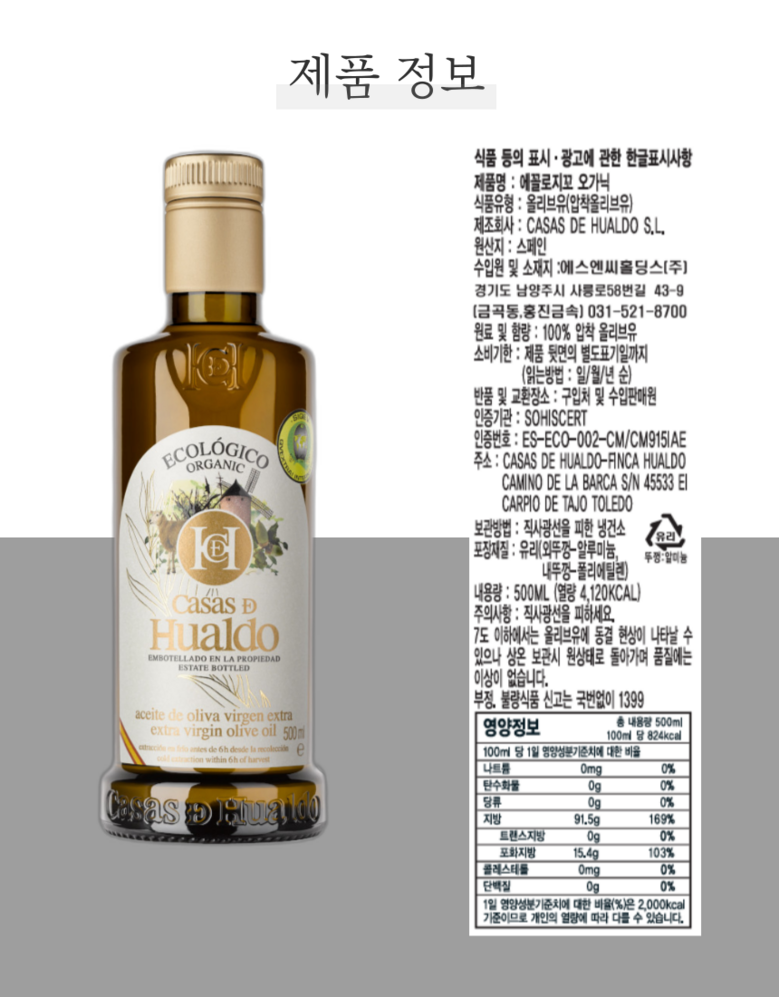 | 품목 또는 명칭 | 스페인 유기농 올리브오일 | 포장단위별 내용물의 용량(중량),수량,크기 | 500ml |