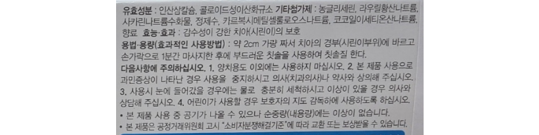 기타첨가제: 농글리세린,라우릴황산나트륨, 사카린나트륨수화물,정제수,카르복시메틸셀룰로오스나트륨,코코일이세티온산나트륨,향료