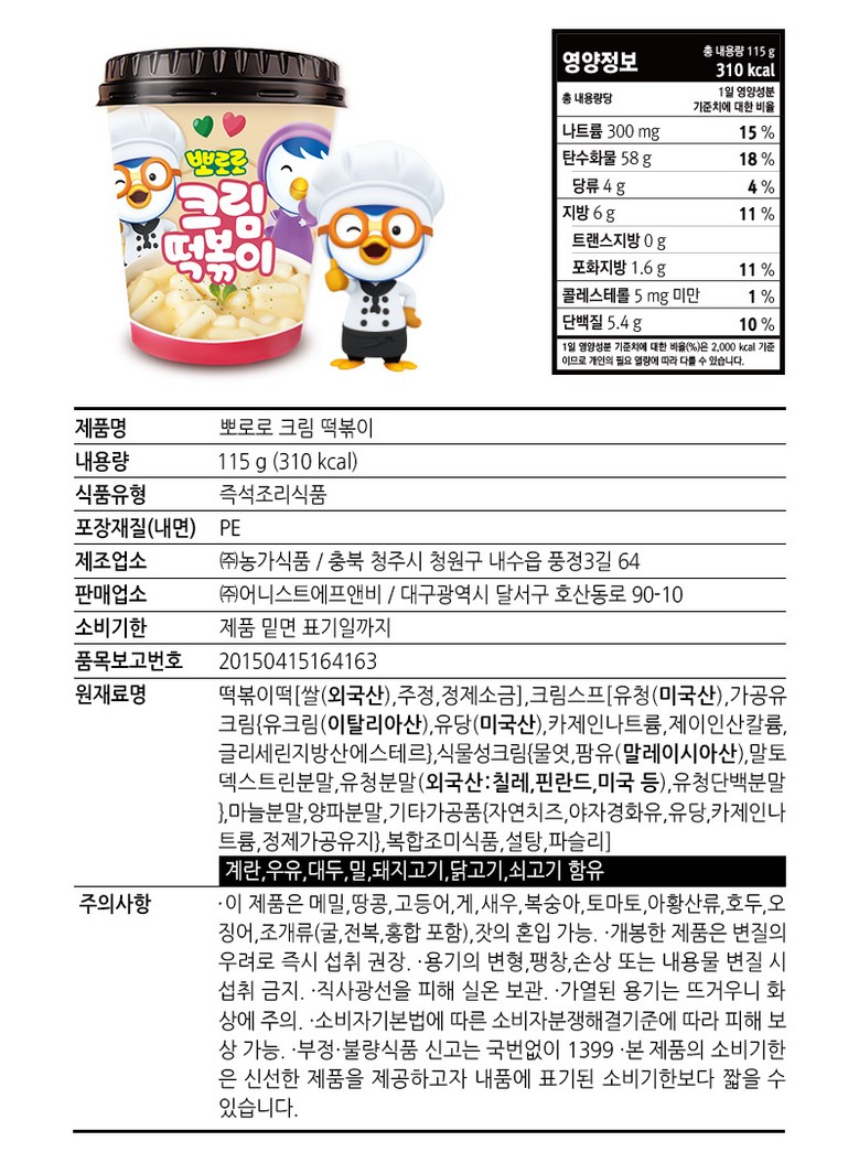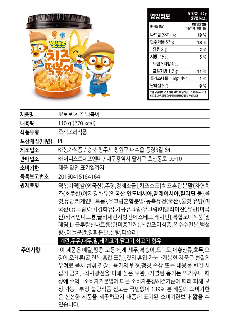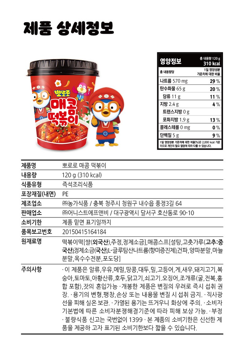 | 제품명 | 뽀로로 떡볶이 | 식품의 유형 | 즉석조리식품 |