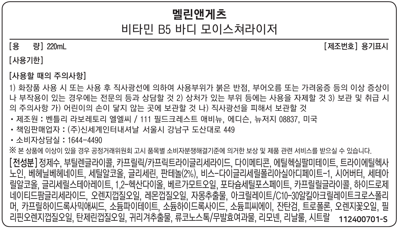 멜린앤게츠 비타민 B5 바디 모이스쳐라이저, 1개, 220ml