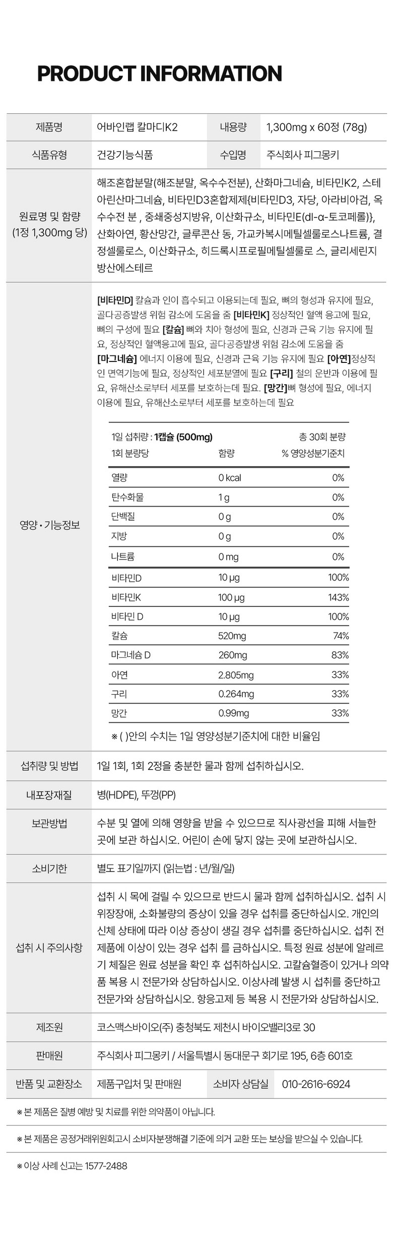 | 원료명 및 함량 | 상품 상세페이지 참조 | 영양정보 | 상품 상세페이지 참조 |