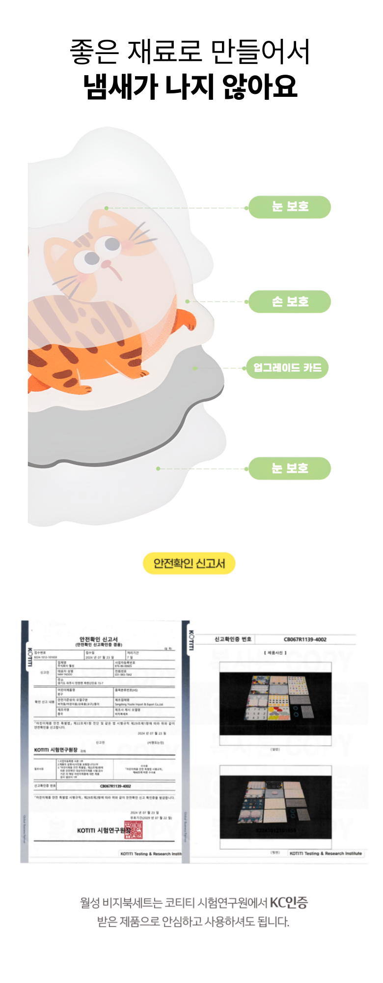 | 품명 및 모델명 | 월성 붙였다떼었다 비지북 2종세트 벨크로 | KC 인증정보 | KC인증 어린이제품 안전확인: CB067R1139-4002 |