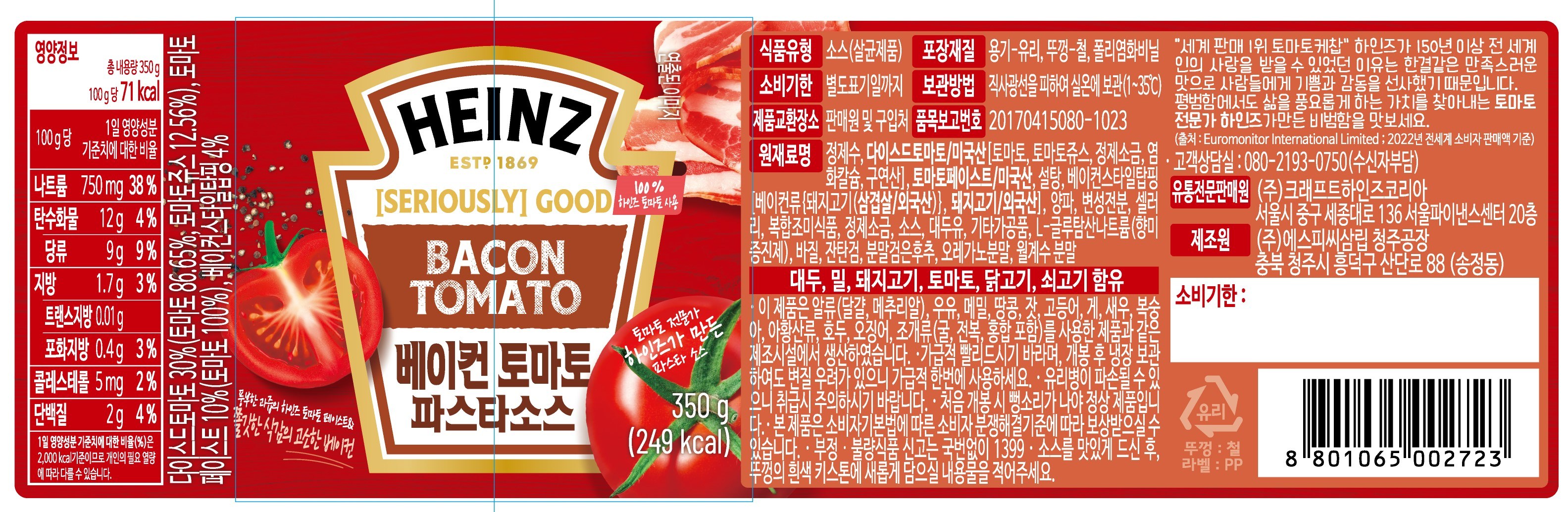 | 제품명 | 베이컨토마토 파스타소스 | 식품의 유형 | 컨텐츠 참조 |