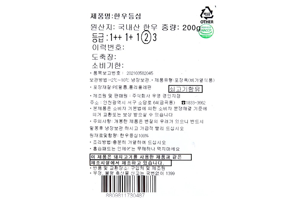 | 제조연월일, 소비기한 또는 품질유지기한 | 업데이트 예정 | 세부 품목군별 표시사항 | 축산물 등급표시 : 2등급 / 이력번호 표시유무 : 이력번호 표시제품임 |