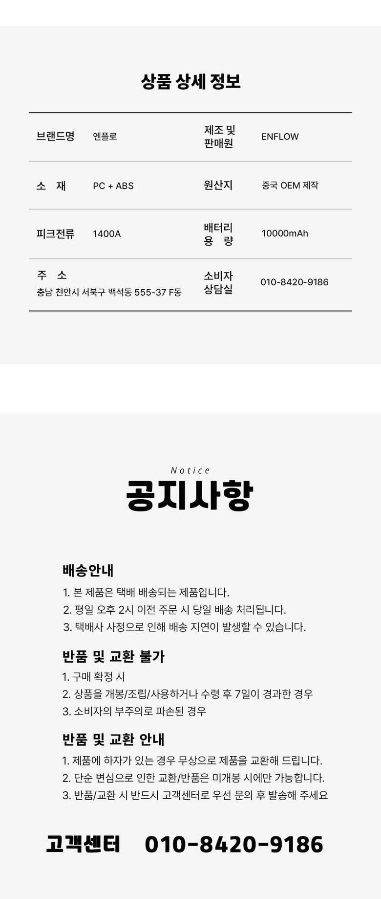 | 품명 및 모델명 | 엔플로 자동차 점프 스타터 스타트 차량용 올인원 방전 배터리 충전 | 동일모델 출시년월 | 2024년 8월 |