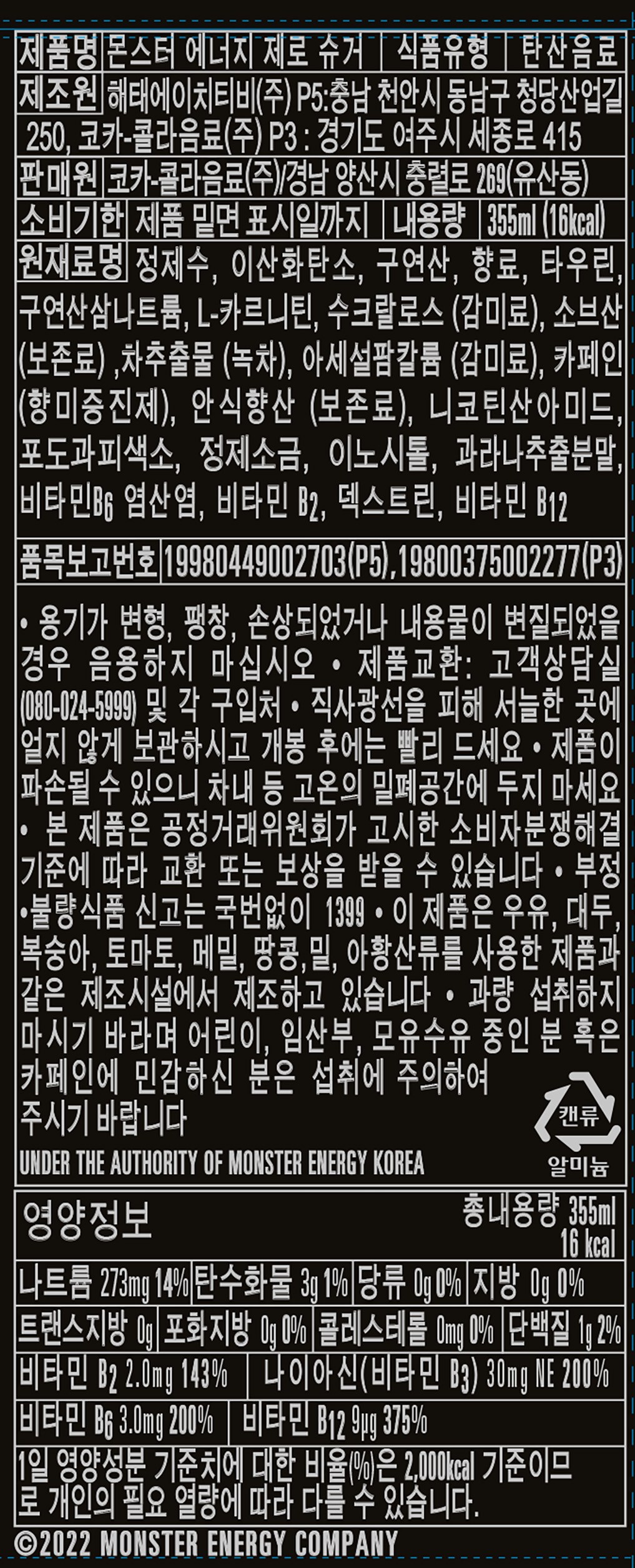 | 포장단위별 내용물의 용량(중량), 수량 | 355ml *24개 | 원재료명 및 함량 | 컨텐츠 참조 |