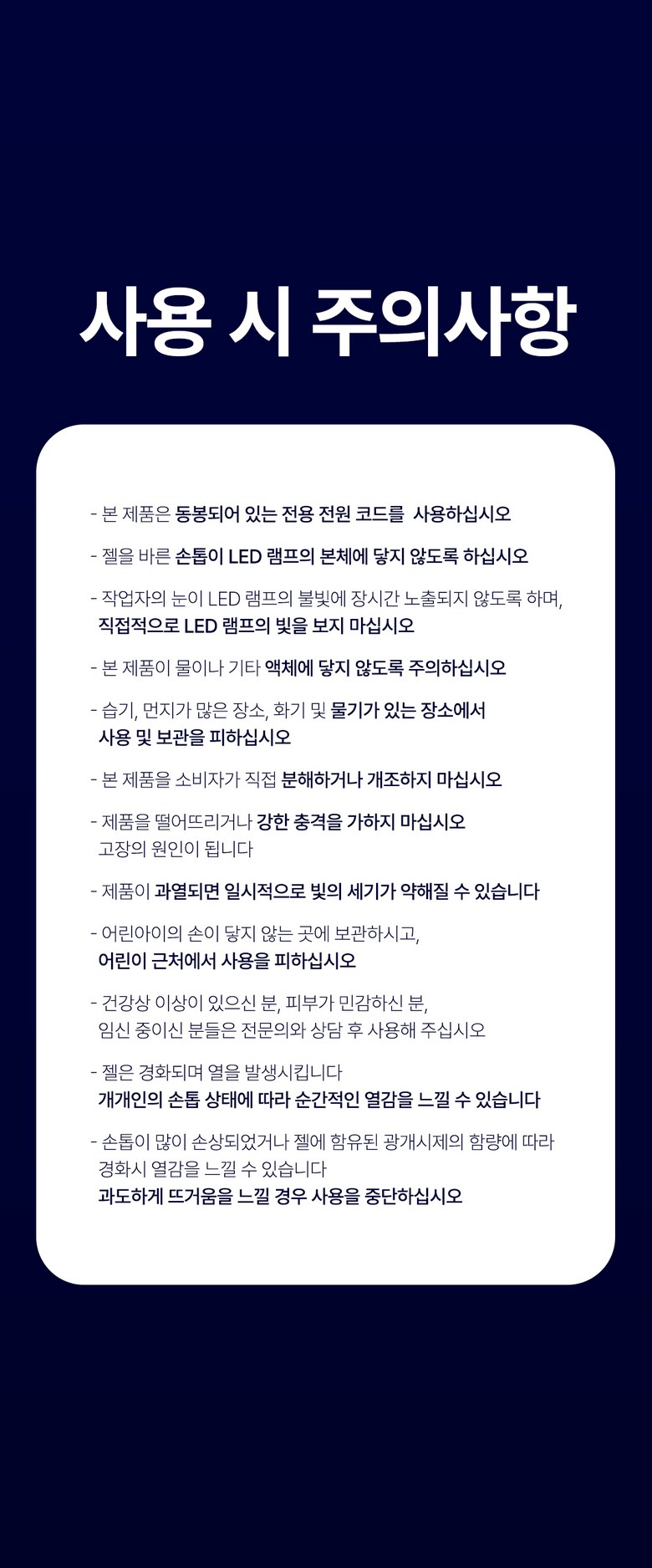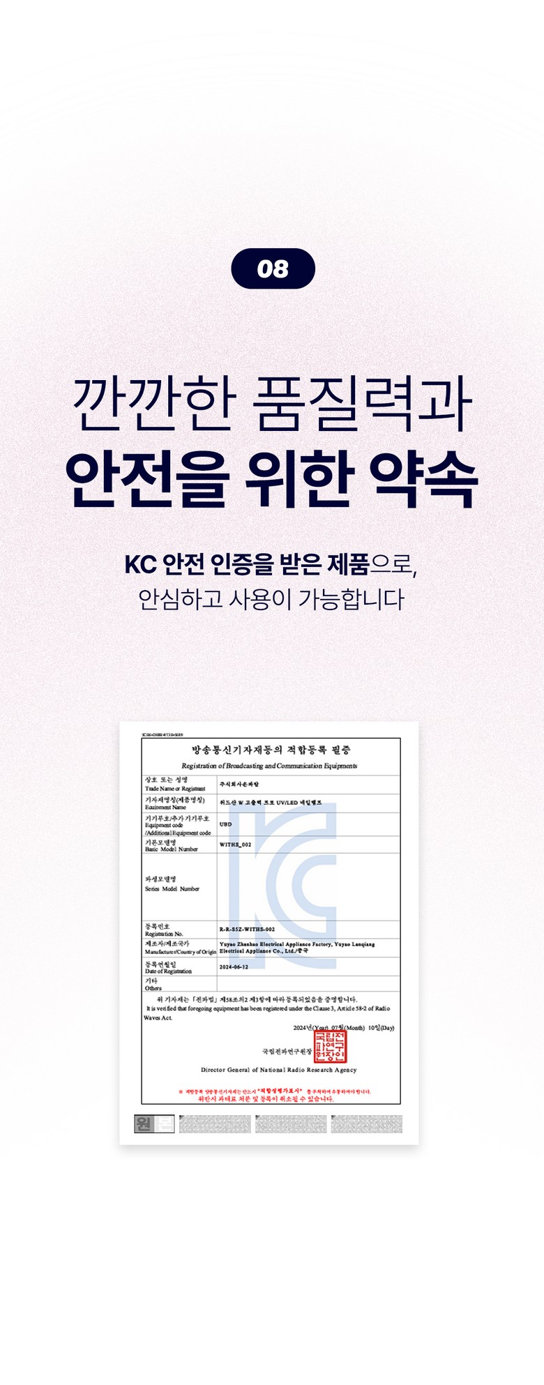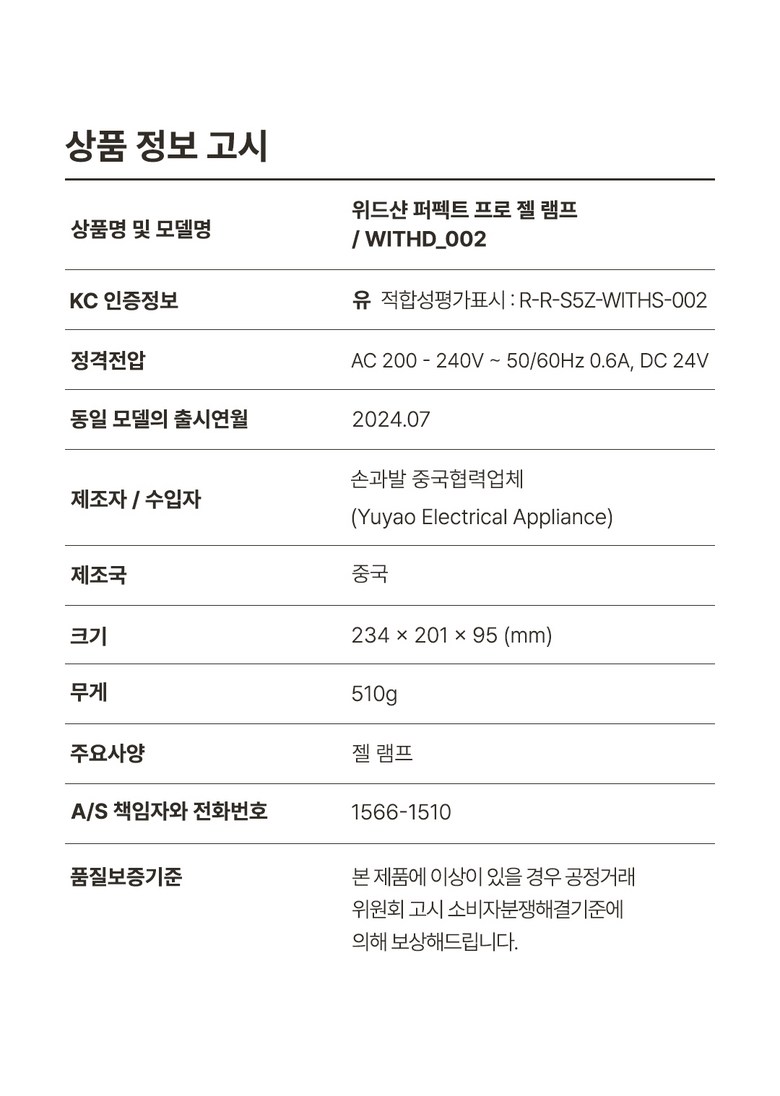 | 품명 및 모델명 | 위드샨 퍼펙트 프로 젤램프 298W / WITHS_002 | KC 인증정보 | [전기용품]안전인증_국가인증-국립전파연구원 한국화학융합시험연구원 HU10584-21019A[방송통신기자재]적합인증_국가인증-국립전파연구원-주식회사손과발 R-RS5Z-WITHS-002 |