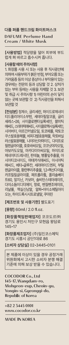 | 화장품제조업자, 화장품책임판매업자 및 맞춤형화장품판매업자 | (주)일진코스메틱/ 코코도르(주) | 제조국 | 대한민국 |
