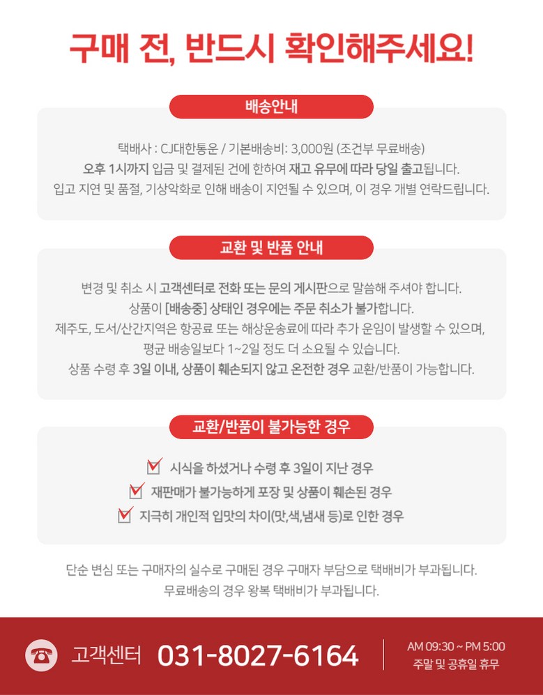 - ㆍ모니터 해상도의 차이로 인해 색상이나 이미지가 실제와 달라, 고객이 단순 변심으로 교환/반품을 무료로 요청하는 경우