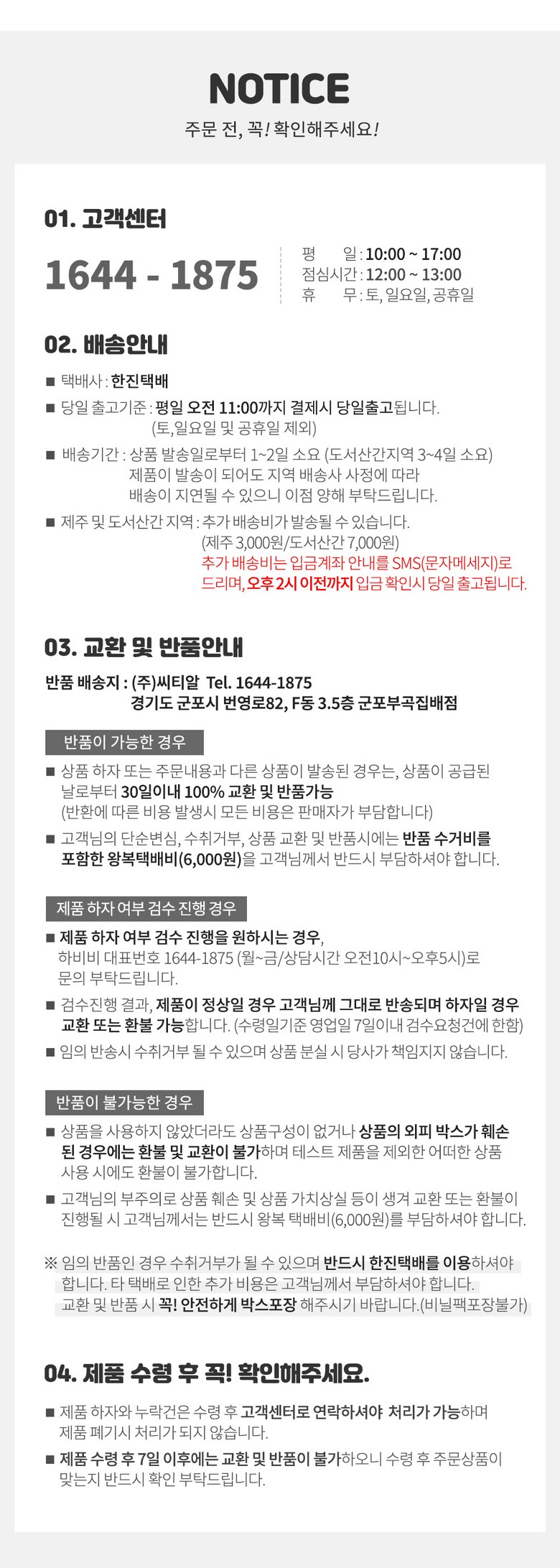 - ㆍ모니터 해상도의 차이로 인해 색상이나 이미지가 실제와 달라, 고객이 단순 변심으로 교환/반품을 무료로 요청하는 경우