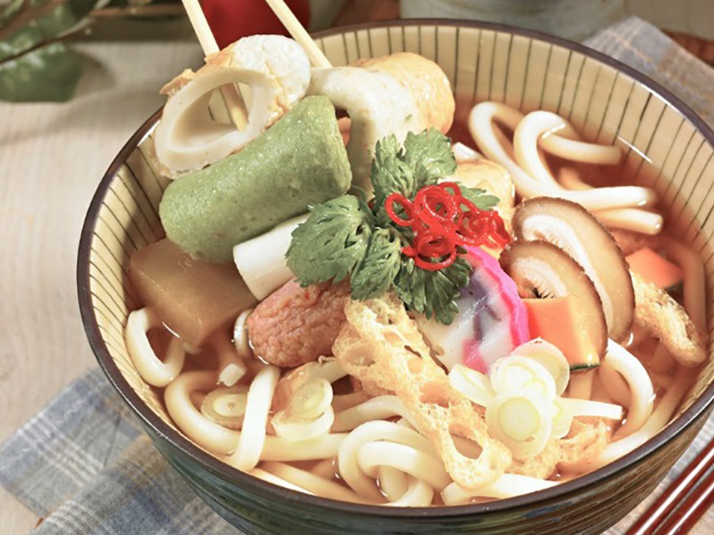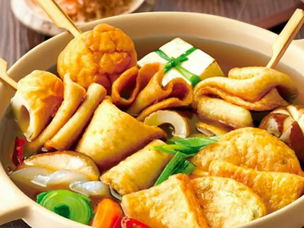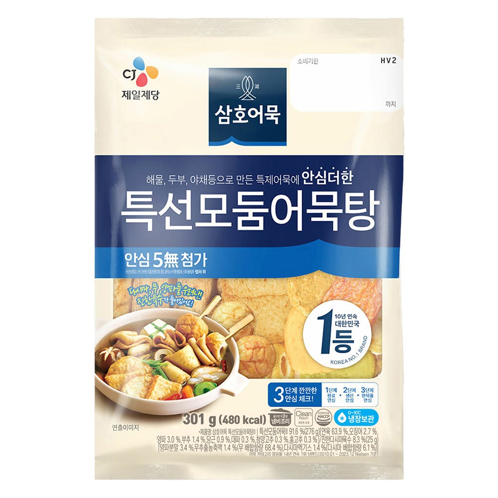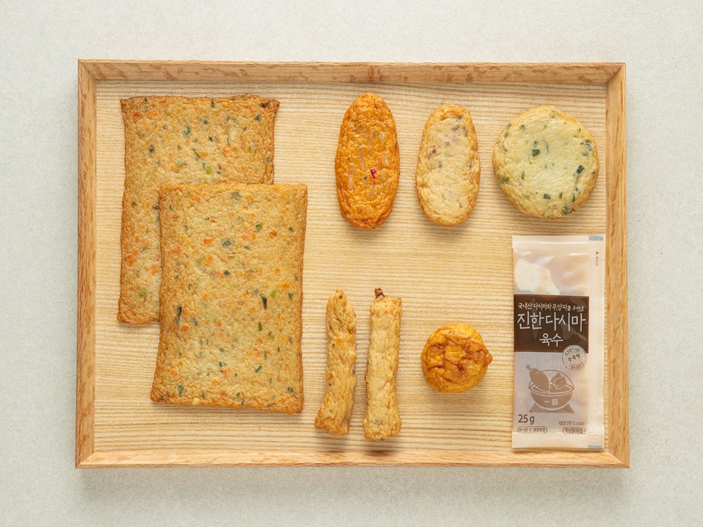 야채사각, 고추 당면 완자, 해물봉, 해물완자, 두부볼, 감자 부추 어묵, 진한 다시마 육수로 구성되어 있습니다.