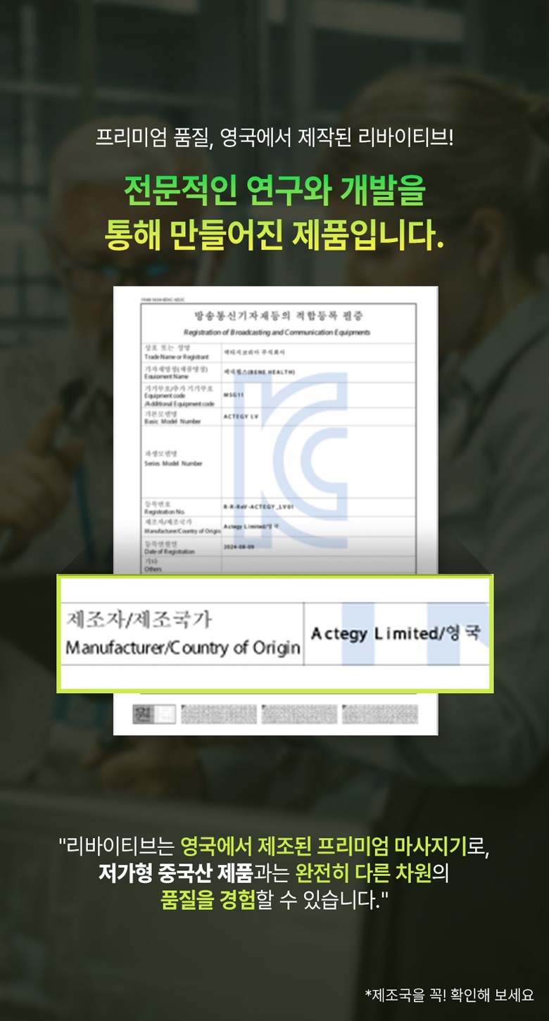 | 품명 및 모델명 | EMS마사지기, ACTEGY LV | KC 인증정보 | 상품이 KC,EMC 대상인 경우, 본품 및 구성품 모두 인증번호 또는 인증번호가 없는 경우 KC 마크 여부를 기재해주세요. (대상이 아닌경우 "해당없음" 기재) |