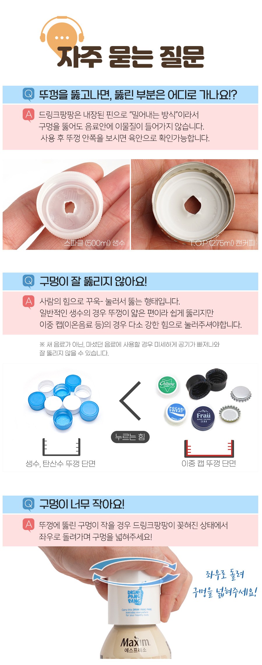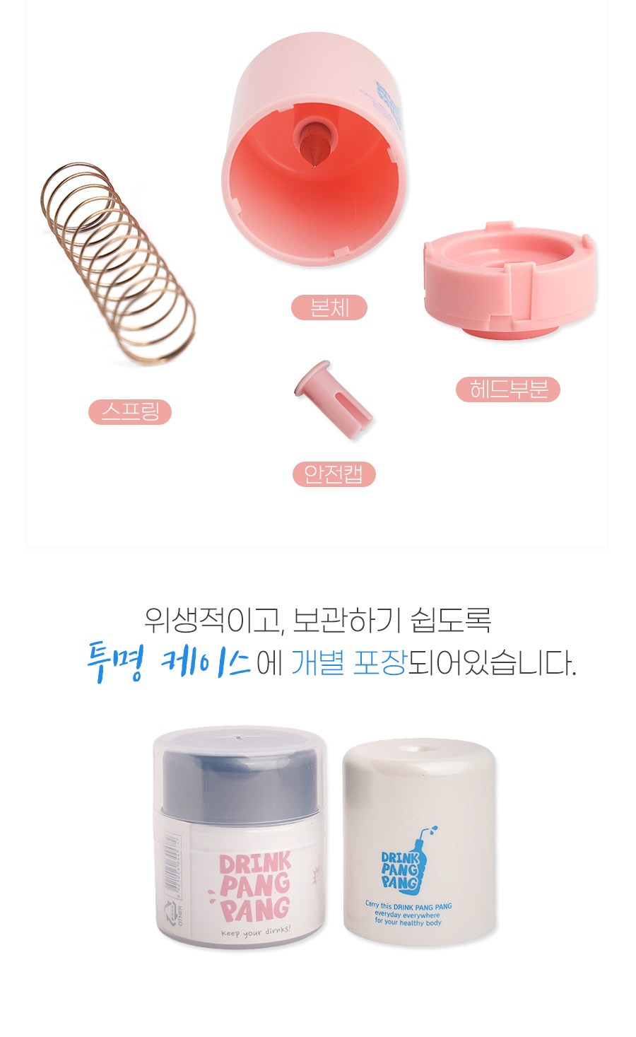 | 품명 및 모델명 | 드링크팡팡 음료 생수 뚜껑 펀치 핑크 1세트 | 인증/허가 사항 | 해당없음 |