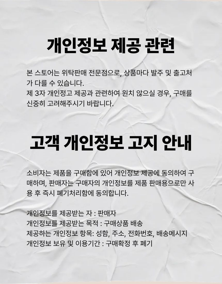 - ㆍ교환/반품에 관한 일반적인 사항은 판매자가 제시사항보다 관계법령이 우선합니다.