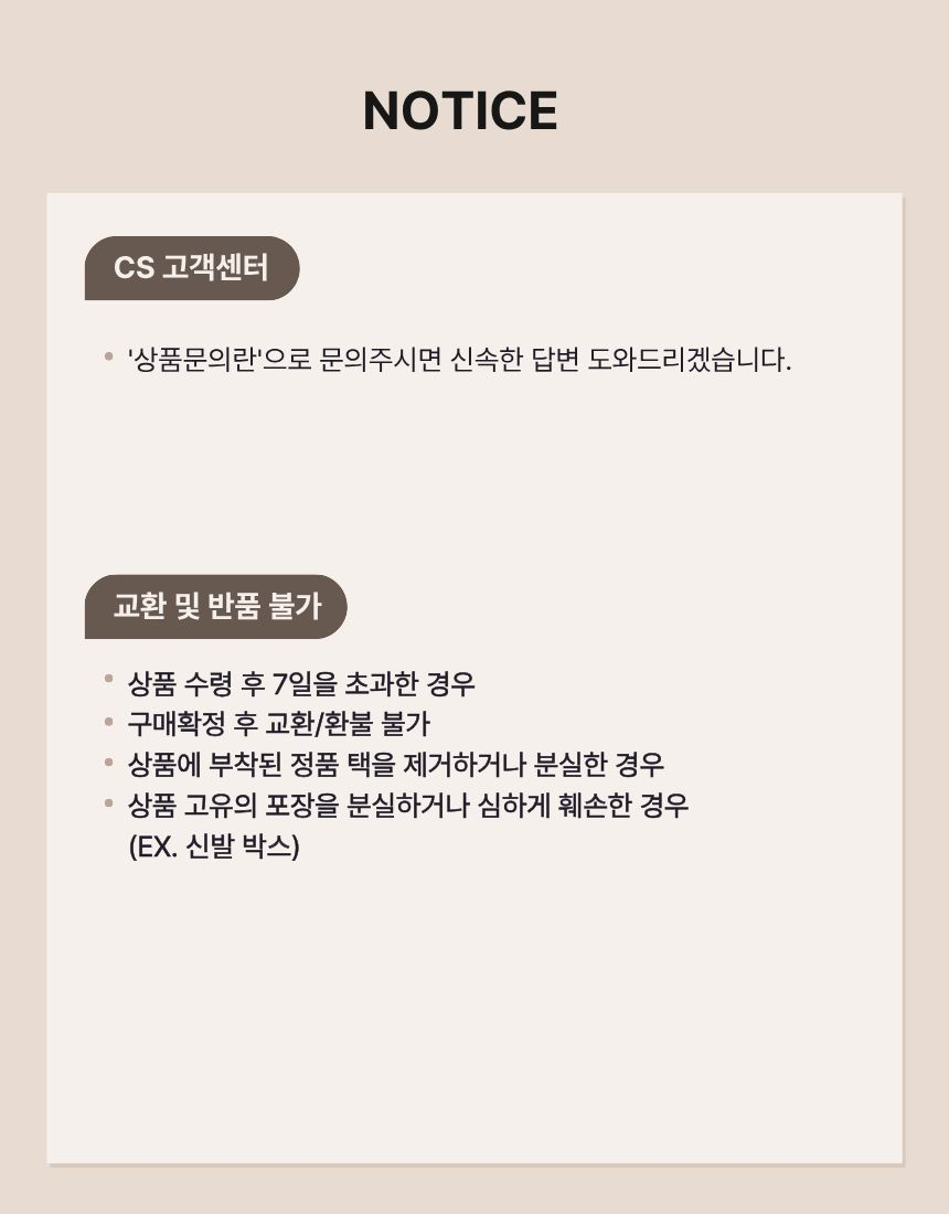 | 교환/반품 비용 (왕복비용) | 12,000원 - 단, 고객 변심의 경우에만 발생 - 도서산간 지역 배송불가 |