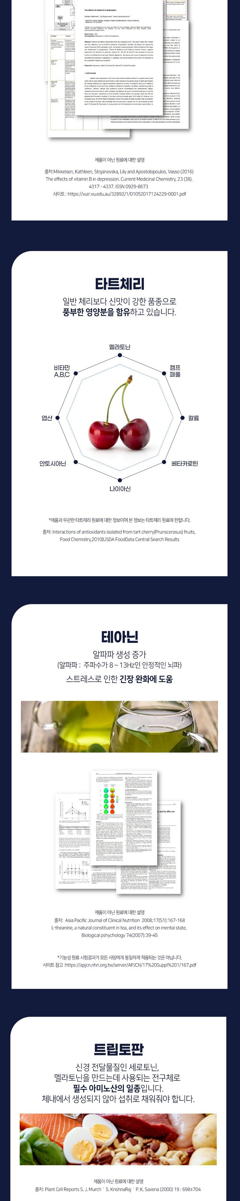 | 포장단위별 내용물의 용량(중량), 수량 | 1개 30정 15g | 원재료명 및 함량 | 토마토추출분말[미국/토마토추출물(배합함량 100%)100%]30%, 말토덱스트린, 결정셀룰로스, 타트 체리농축분말[타트체리농축액(고형분 11%)(타트체리농축액(미국) 70%, 덱스트린, 아라비아검]8% 산화마그네슘, 대나무수액추출분말(인도), 옥수수단백추출분말, 캐모마일추출분말, 테아닌, 감태추출분 말, 레몬밤추출분말, 로즈마리추출분말, 시계꽃추출분말, L-트립토판, 흑하랑상추추출분말[흑하량상추 추출물(고형분 2%) 70%] 0.5%, 합성향료(가바향), 혼합제제(비타민B12 0.1%혼합제제)(말토덱스트 린, 구연산삼나트륨, 구연산, 비타민B12), 비타민B6염산염 토마토함유 |