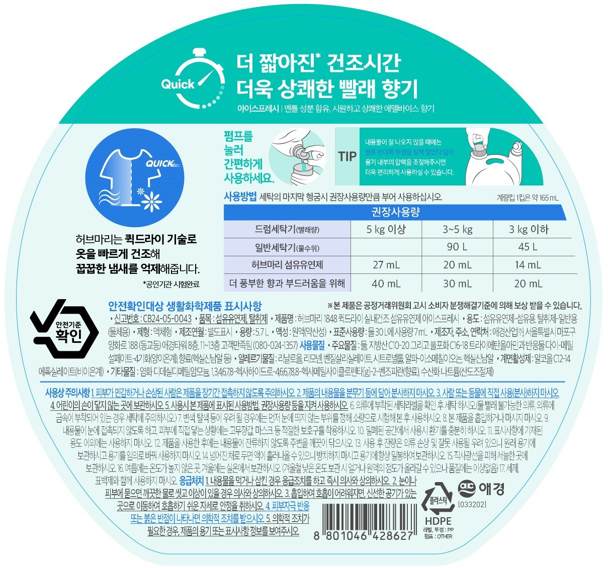 | 품목 및 제품명 | 섬유유연제,탈취제 / 허브마리 1848 퀵드라이 실내건조 섬유유연제 아이스프레시 | 용도(표백제의 경우 계열을 함께표시) 및 제형 | 섬유용,일반용-물체용 / 비분사형-액체형 |