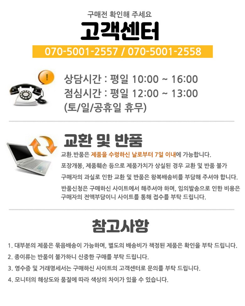 - ㆍ모니터 해상도의 차이로 인해 색상이나 이미지가 실제와 달라, 고객이 단순 변심으로 교환/반품을 무료로 요청하는 경우