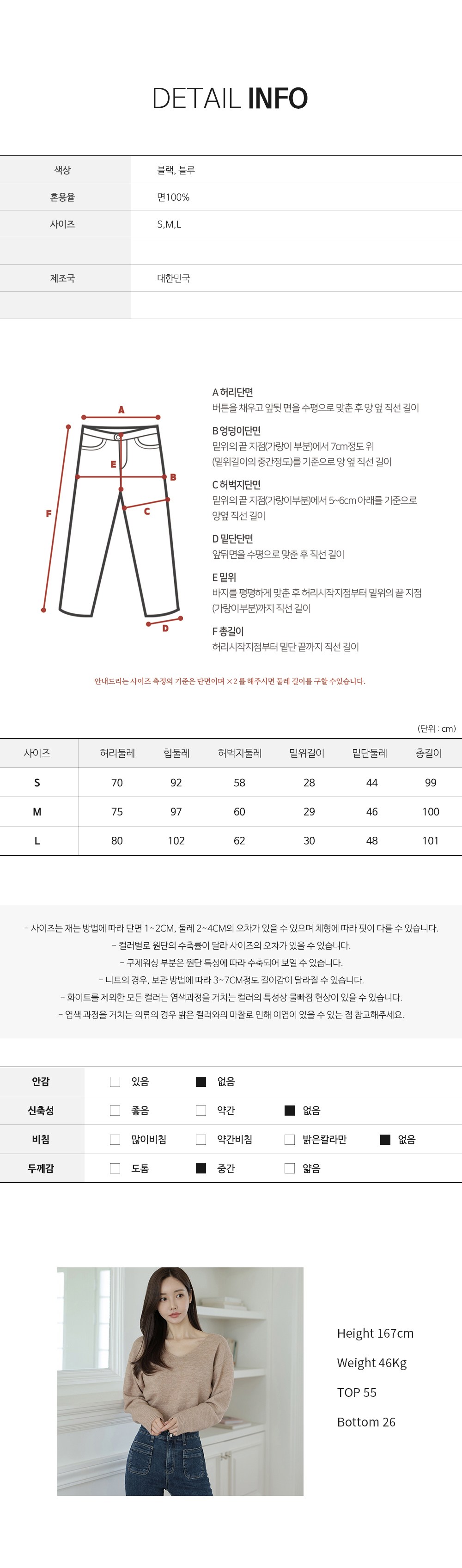 - 하의류 길이: 발목 아래 길이(롱바지 길이)