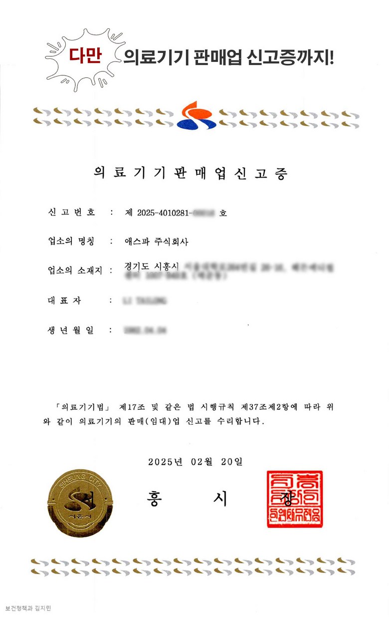 상호/대표자 | 애스파 주식회사 / LI TAILONG | 사업장 소재지 | 경기도 시흥시 서울대학로264번길 26-16 1007-B49호(배곧동,해든메디컬센터) |