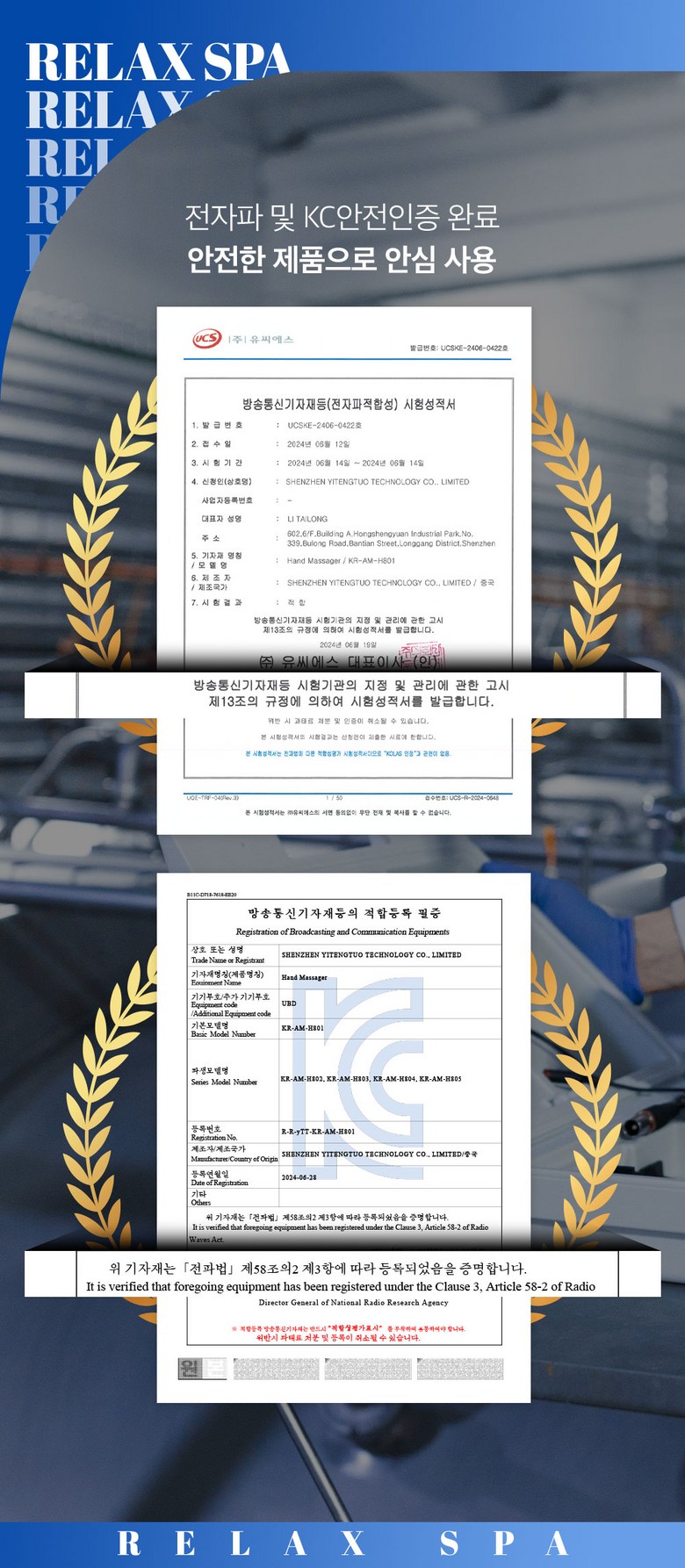 | 품명 및 모델명 | 릴렉스파 KR-AM-H801 | KC 인증정보 | KC인증 번호:R-R-yTT-KR-AM-H801배터리 신고 번호:XU100748-18013A |