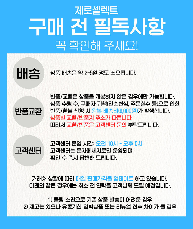 - ㆍ교환/반품에 관한 일반적인 사항은 판매자가 제시사항보다 관계법령이 우선합니다.