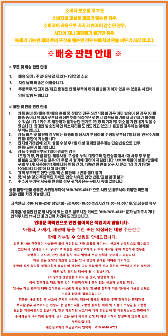 - ㆍ교환/반품에 관한 일반적인 사항은 판매자가 제시사항보다 관계법령이 우선합니다.
