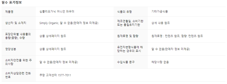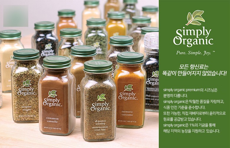 | 생산자 및 소재지 | Simply Organic, US | 제조연월일, 소비기한 또는 품질유지기한 | 상세 내용 참조 |