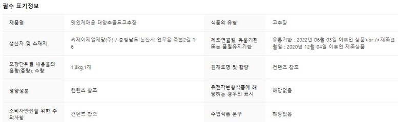 | 제조연월일, 소비기한 또는 품질유지기한 | 상품 상세페이지 참조 | 세부 품목군별 표시사항 | 상품 상세페이지 참조 |