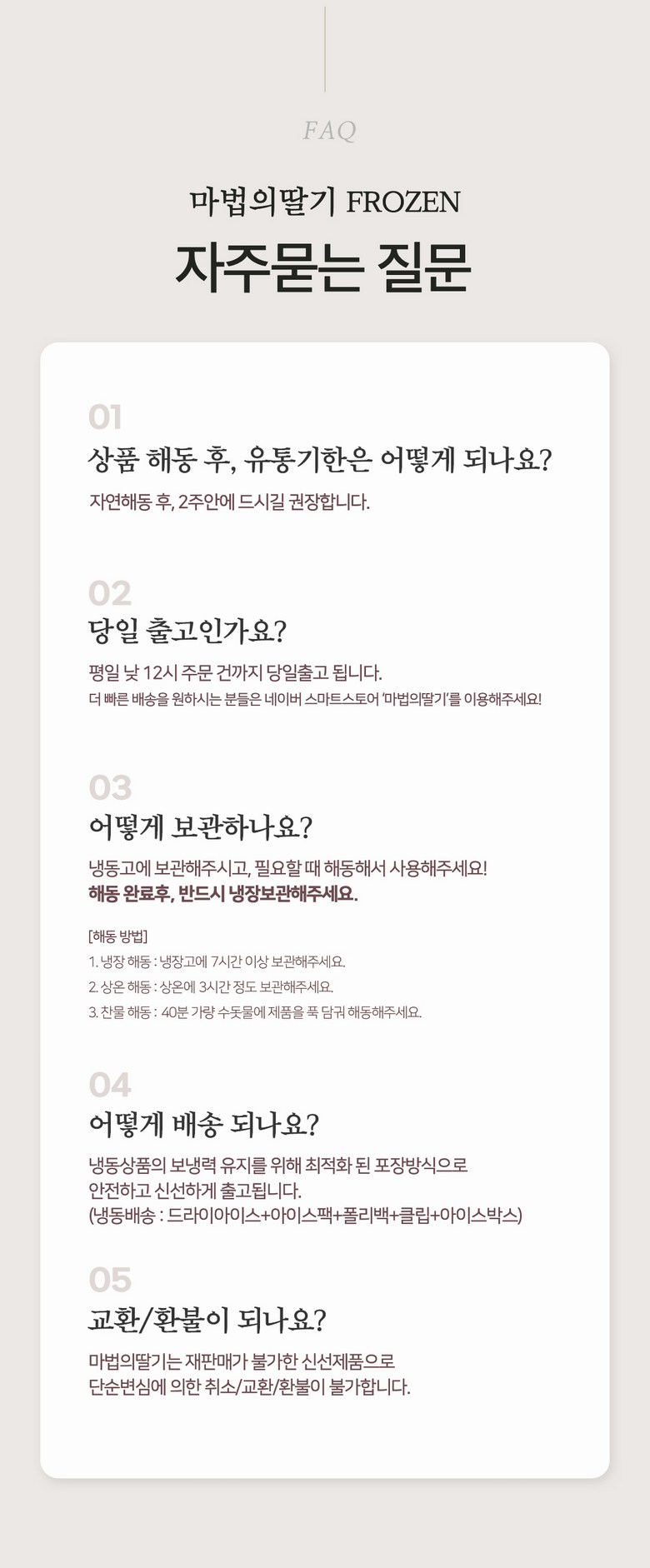 | 계절상품/식품/화장품 | ㆍ신선/냉장/냉동 상품의 단순변심의 경우 ㆍ뷰티 상품 이용 시 트러블(알러지, 붉은 반점, 가려움, 따가움)이 발생하는 경우, |