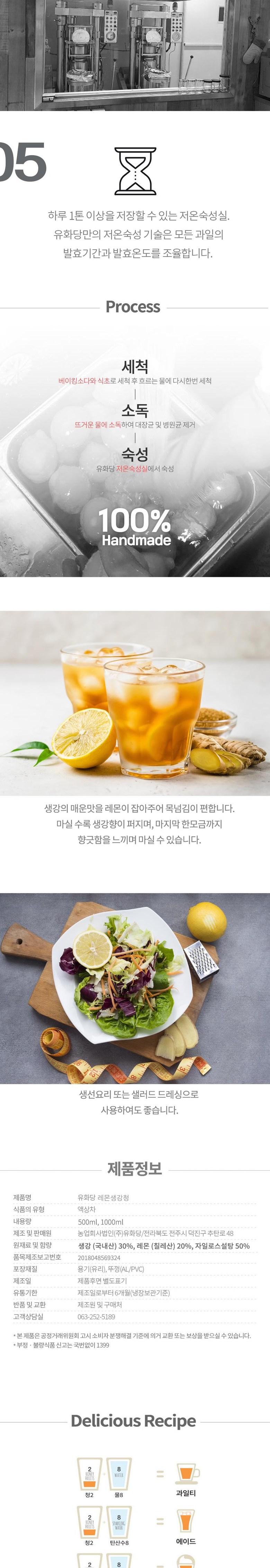 | 포장단위별 내용물의 용량(중량), 수량 | 유화당 레몬생강청 500ml / 1병 | 원재료명 및 함량 | 생강(국내산)30%,레몬(칠레산)20%,자이로스설탕50% |