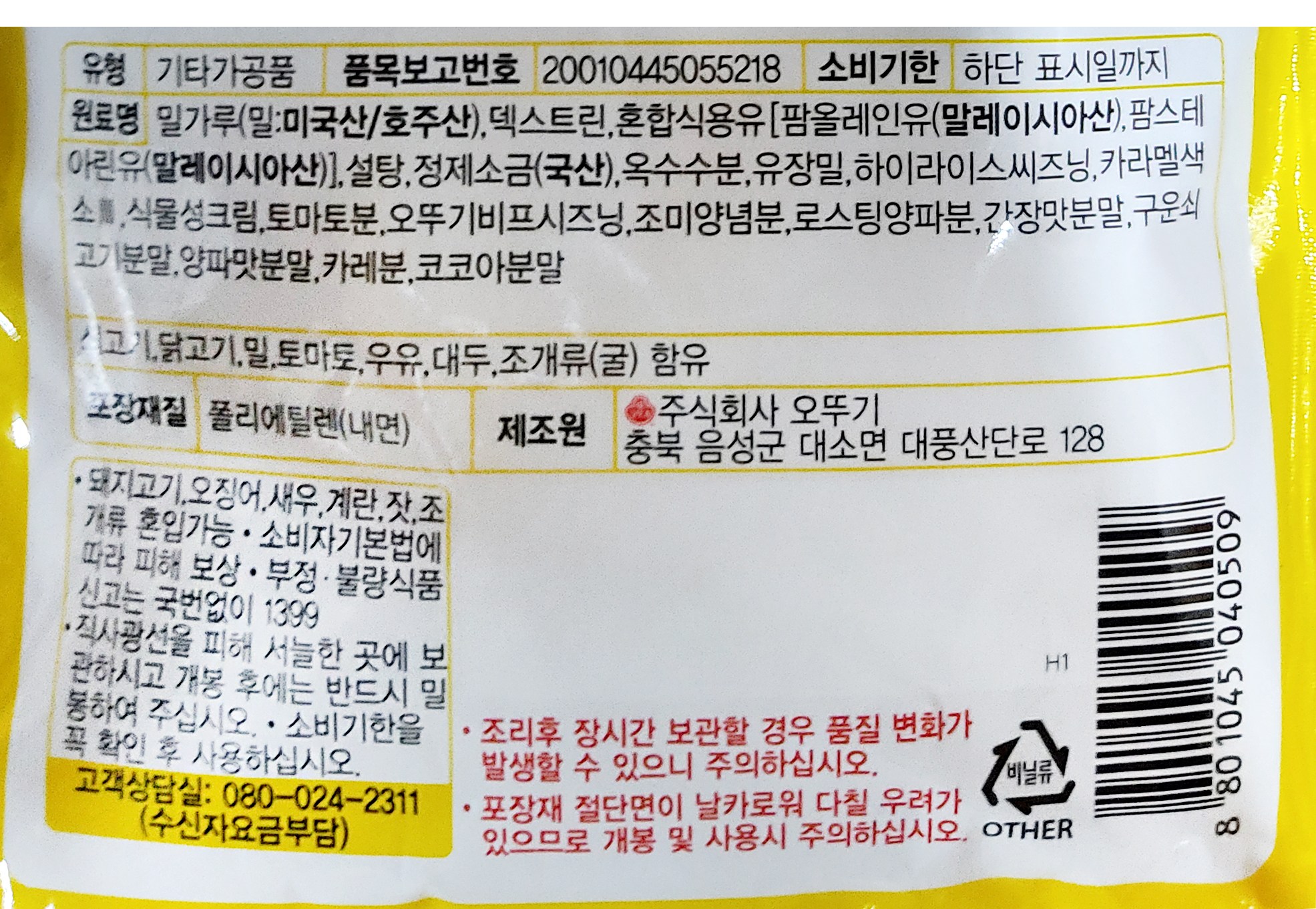 | 생산자 및 소재지 | 오뚜기 | 제조연월일, 소비기한 또는 품질유지기한 | 소비기한(또는 유통기한) : 2026년 09월 02일 이거나 그 이후인 상품<br />제조년월일 : 1945년 08월 15일 이후인 제조상품 |