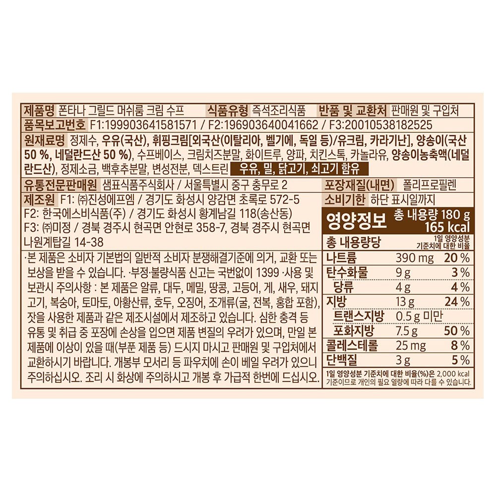 | 제품명 | 폰타나 그릴드 머쉬룸 크림 수프 | 식품의 유형 | 컨텐츠 참조 |