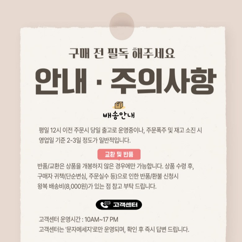 | 교환/반품 비용 (왕복비용) | 8,000원 - 단, 고객 변심의 경우에만 발생 - 도서산간 지역 배송불가 |