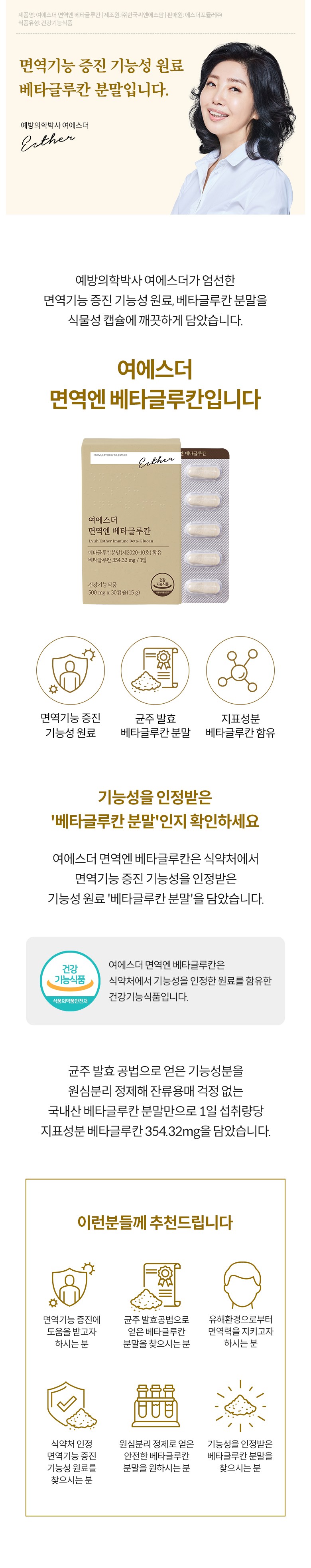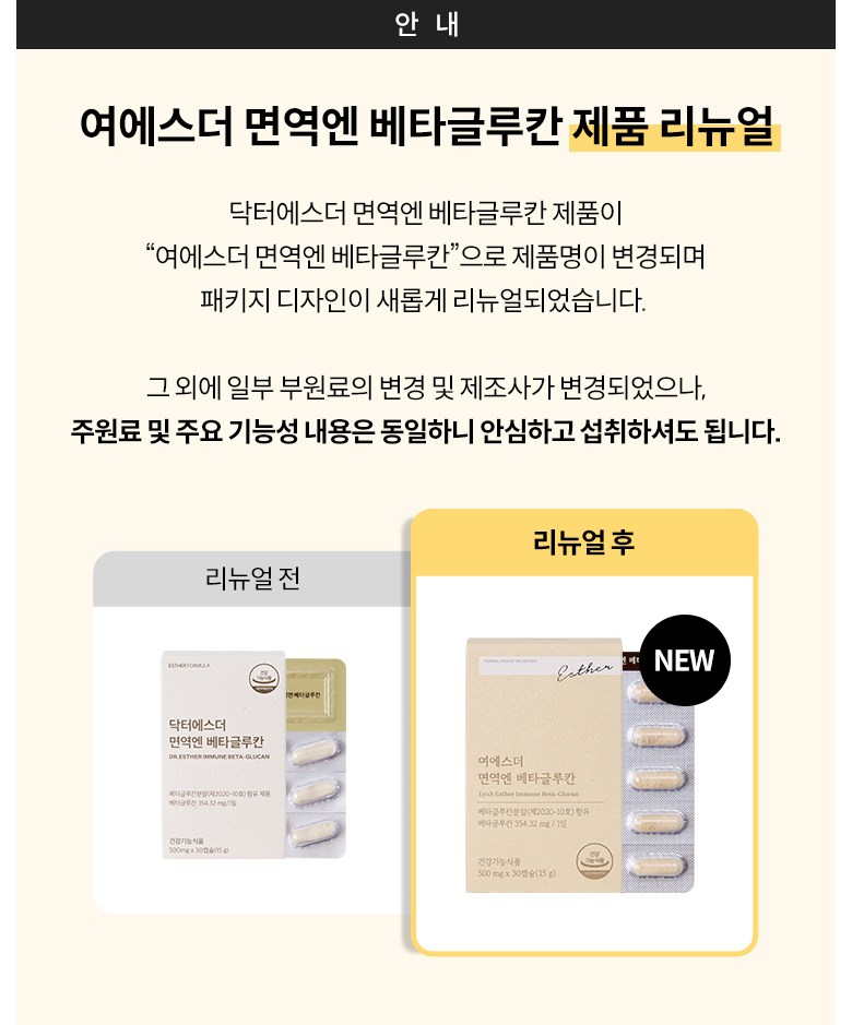 | 제품명 | 여에스더 면역엔 베타글루칸 (건강기능식품에 관한 법률에 따른 심의 필함 /250810612) | 제조업소의 명칭과 소재지 | ㈜한국씨엔에스팜 / 충청북도 음성군 원남면 상경로 16 |