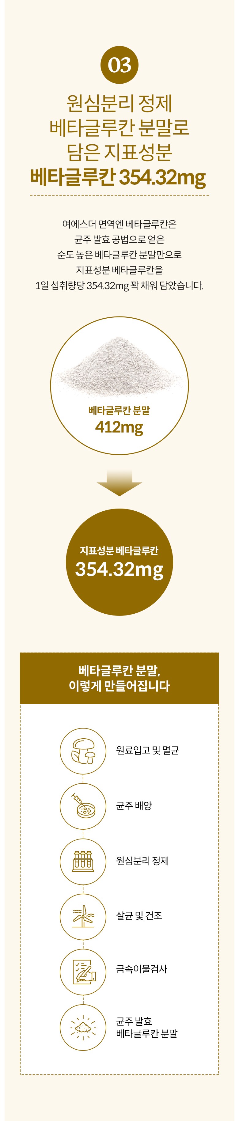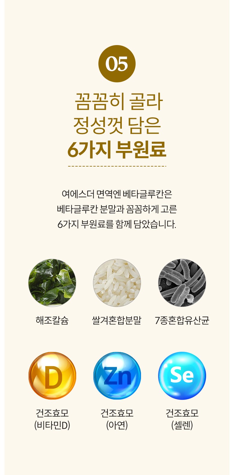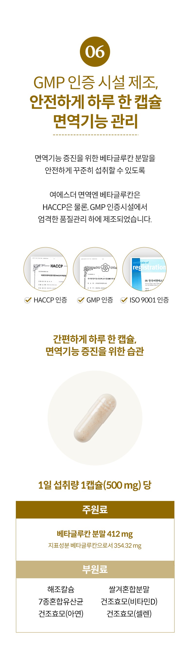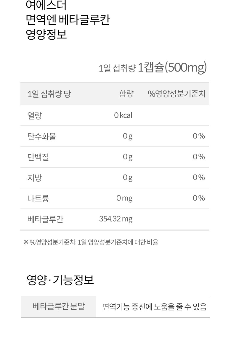 | 원료명 및 함량 | 베타글루칸분말(국내산), 해조칼슘(영국산), 쌀겨혼합분말{쌀겨추출분말(미국산), 정제포도당}, 7종혼합유산균, 건조효모(비타민D), 건조효모(아연), 건조효모(셀렌) [캡슐기제] 히드록시프로필메틸셀룰로스, 정제수, 카라기난, 소르비탄지방산에스테르, 염화마그네슘, 글리세린, 염화칼륨 *알레르기 주의 물질: 우유, 대두 함유 | 영양정보 | 상품 상세페이지 참조 |
