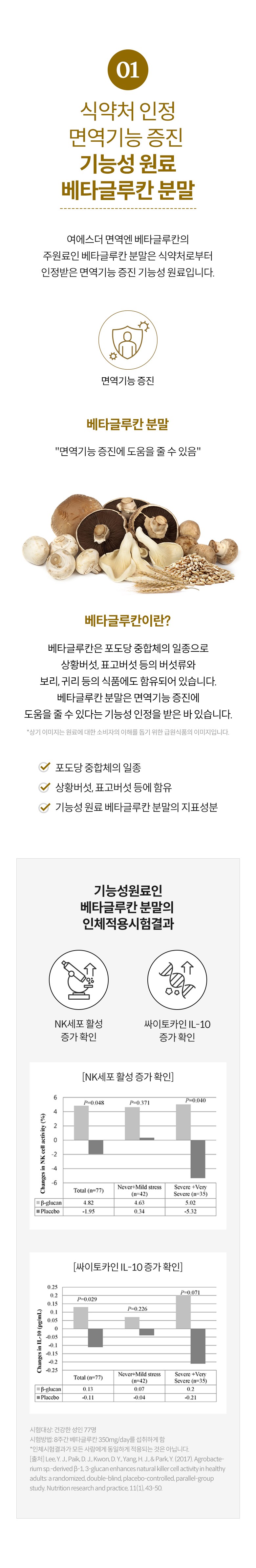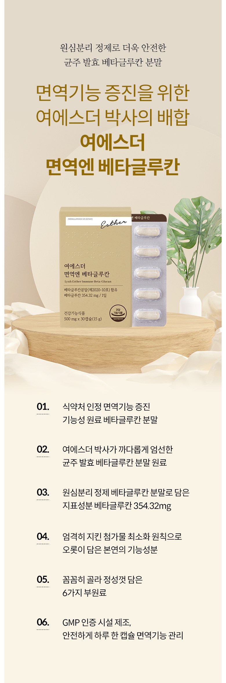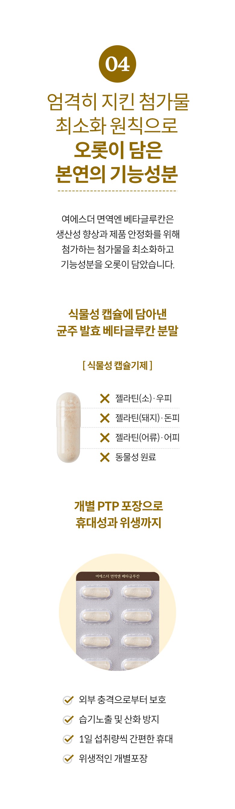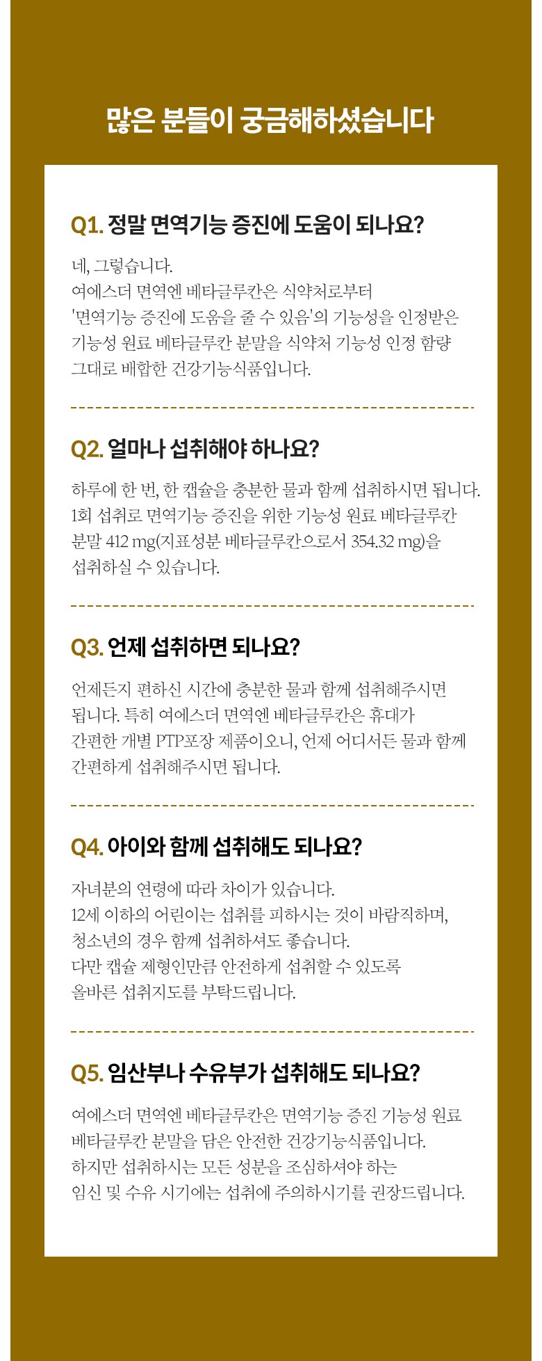 | 원료명 및 함량 | 베타글루칸분말(국내산), 해조칼슘(영국산), 쌀겨혼합분말{쌀겨추출분말(미국산), 정제포도당}, 7종혼합유산균, 건조효모(비타민D), 건조효모(아연), 건조효모(셀렌) [캡슐기제] 히드록시프로필메틸셀룰로스, 정제수, 카라기난, 소르비탄지방산에스테르, 염화마그네슘, 글리세린, 염화칼륨 *알레르기 주의 물질: 우유, 대두 함유 | 영양정보 | 상품 상세페이지 참조 |