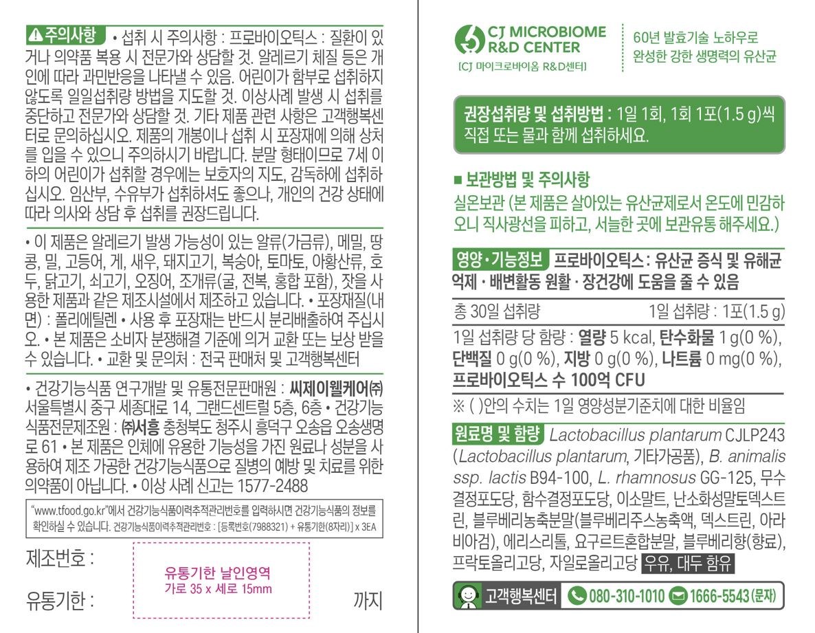 | 제품명 | 건강한 생유산균 100억 | 제조업소의 명칭과 소재지 | 컨텐츠 참조 |