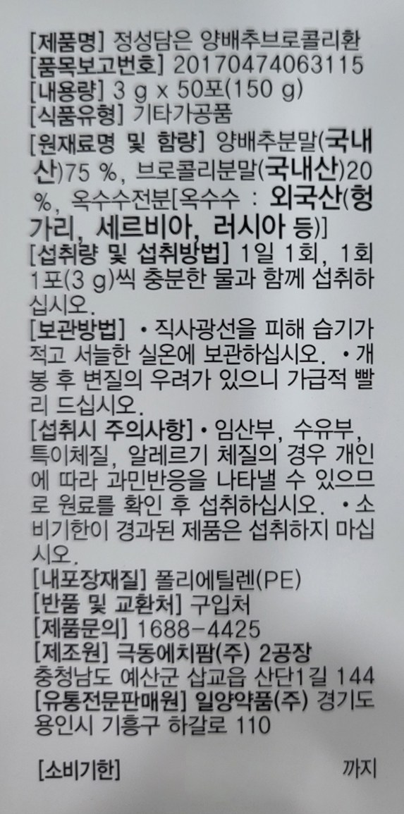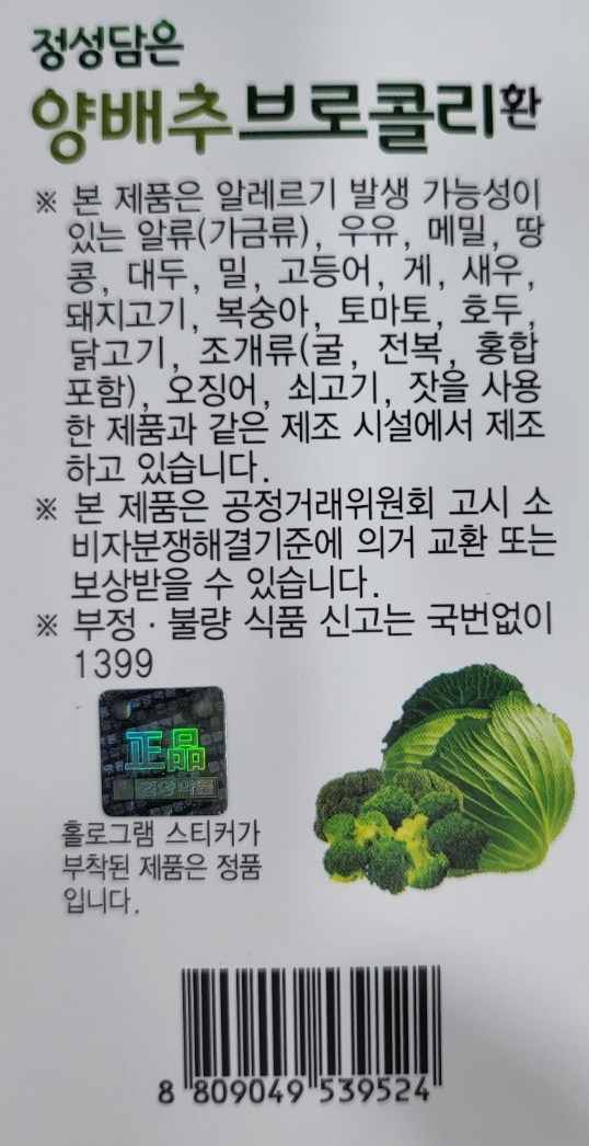| 제품명 | 정성담은 양배추브로콜리환 | 식품의 유형 | 기타가공품 |