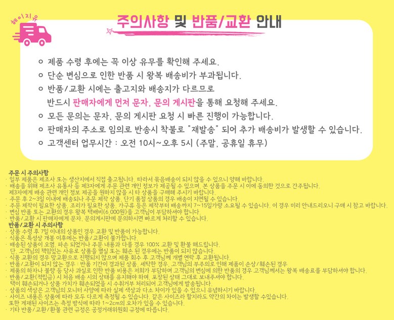 - ㆍ모니터 해상도의 차이로 인해 색상이나 이미지가 실제와 달라, 고객이 단순 변심으로 교환/반품을 무료로 요청하는 경우