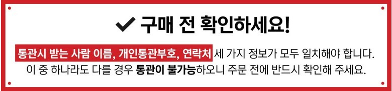 - 법규 개정에 따라 개인통관고유부호 검증 절차가 강화되었습니다. 결제 단계에서 받는 사람의 정보가 관세청 등록 정보 (성명, 휴대폰, 개인통관고유부호, 주소) 와 일치하는지 확인해주세요.